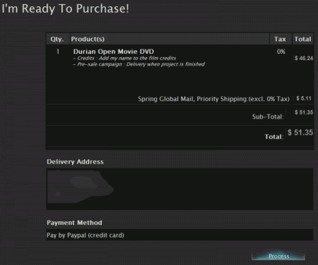 そこで、少しでもBlenderの発展に貢献したいと思ったのなら、Blender Storeで教本やDVDを購入してみては如何でしょうか。教本はAmazon.co.jpでも翻訳版や輸入版が購入可能ですが、チュートリアルDVDはここでしか買えません。本記事ではBlender Storeでのアカウント登録方法から注文、支払いまでを画像付で説明します。今回は、2010年公開予定のOpen Movie Project "Durian"のDVDを予約してみることにしました。2009年9月15日までに予約すると、ムービーのエンドクレジットに購入者の名前を載せてもらえます。ぜひ、この機会に購入を検討してみて下さい。